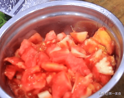 2.準備一個大番茄,洗幹凈,用十字形刀,在沸水中加熱一會兒,燙傷後去皮,然後切成番茄丁備用。