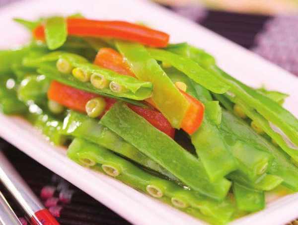材料:荷蘭豆300克,紅椒50克,精鹽1/2小匙,味精、香油各1/3小匙,植物油1大匙。