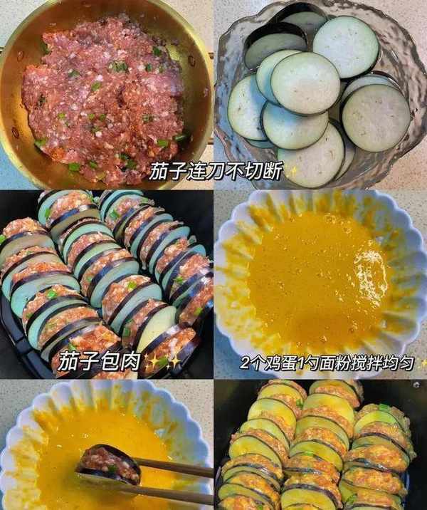 茄子:2個,豬肉餡:250克,雞蛋:2個,面粉,雞精,生抽,蠔油,料酒,鹽,黑胡椒,薑末,蔥花