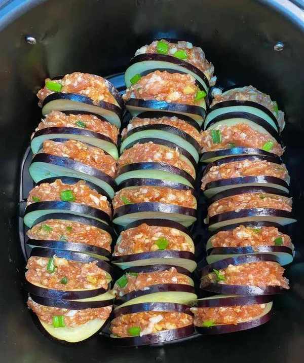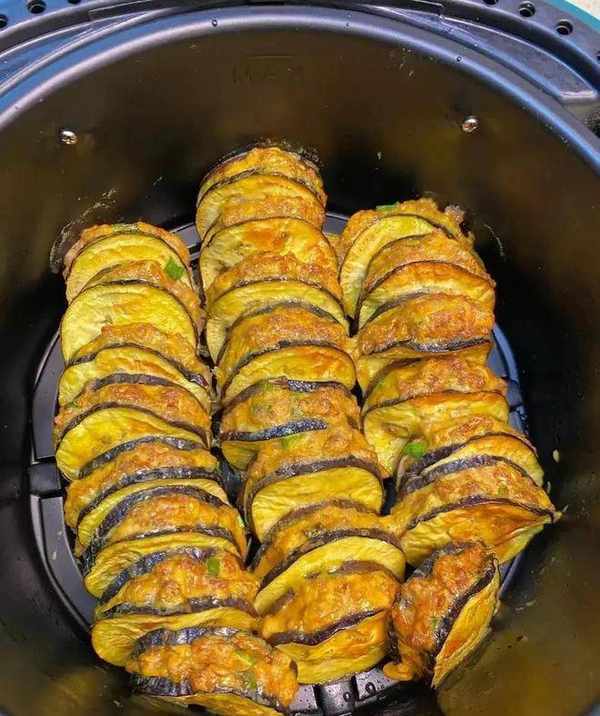 5.將包好肉餡的茄子放入空氣炸鍋或烤箱,以180度烤制12分鐘,中途翻一次面,直至茄子烤熟。
