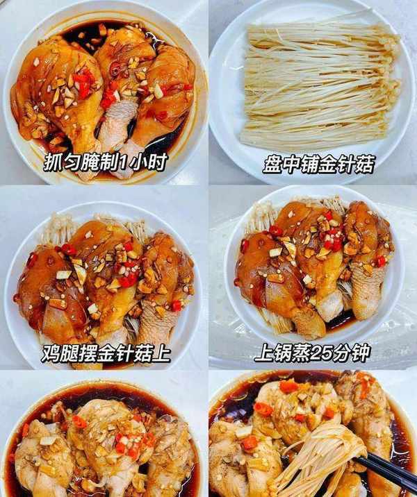 在蒸之前,先將金針菇洗凈,然後放在碗中,這樣可以防止雞腿粘在碗底上。