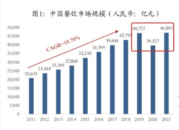 到瞭2021年,疫情放緩,大傢生活工作能自由活動瞭,餐飲業市場規模很快漲上來瞭,觸達46895億。