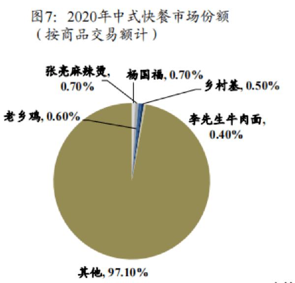 我們日常見到的張亮麻辣燙、楊國福麻辣燙、鄉村基、老鄉雞等快餐店,占很小部分,隻有0.5%市場份額而已。