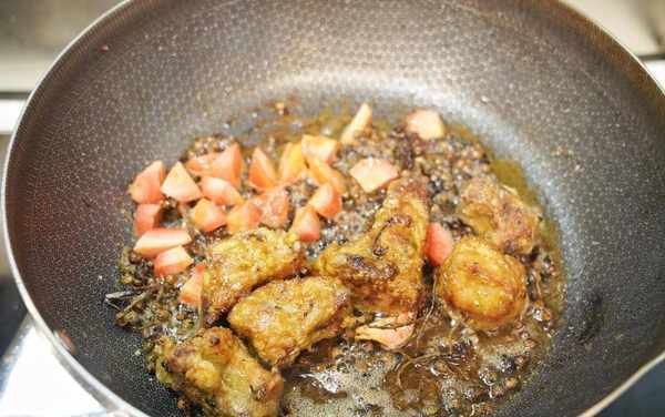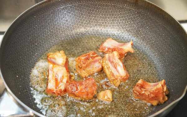 8、放入排骨一起煎炸,翻炒至表面金黃