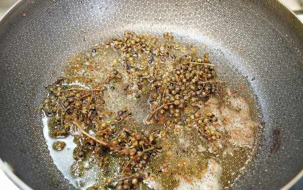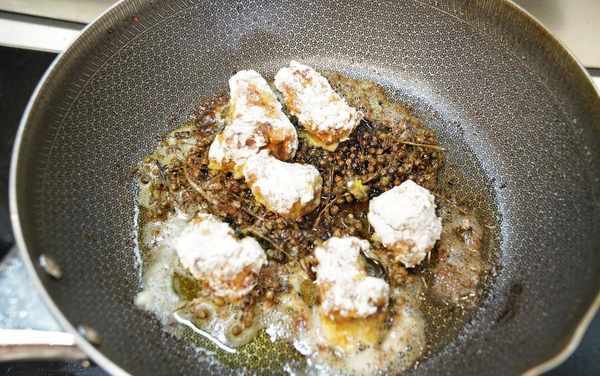 7、利用炸排骨的餘油放入花椒粒煎炸出香味