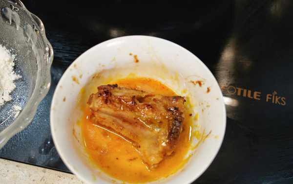 5、把醃制好的排骨放入雞蛋液裡翻滾一遍