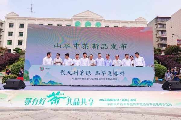 在簽約儀式後,舉行瞭2023年“山水中茶”新品發佈,保靖縣、雷山縣、石阡縣、恩施州、咸豐縣、古丈縣、桂東縣等領導上臺為中茶山水中茶新品揭幕。