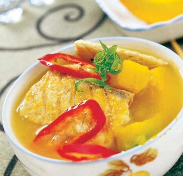 3 鍋置火上,加入高湯燒沸,放入帶魚段、南瓜塊,加入調料煮 25 分鐘至入味,撒入紅椒圈,出鍋裝碗即可。