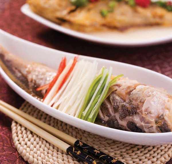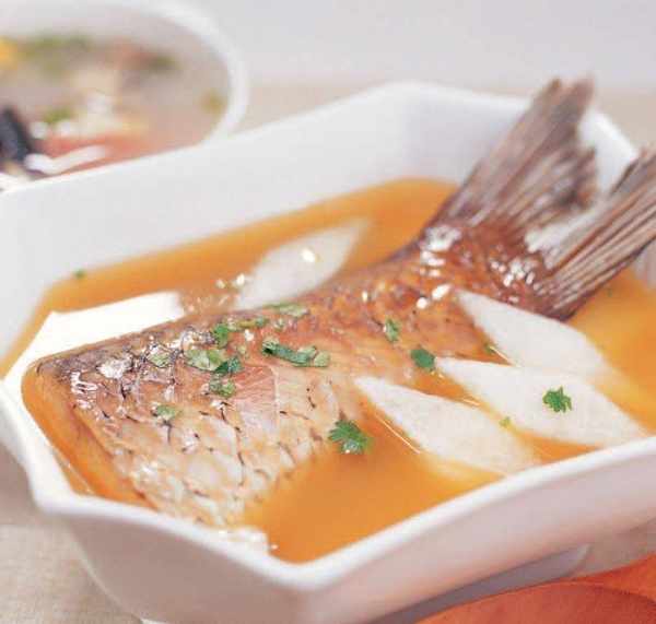 3 鍋中放入薑絲,加入精鹽、料酒、醬油、白糖、胡椒粉、味精及適量煮魚原湯調勻,澆在魚盤中,撒上蔥絲,淋入明油,即可上桌食用。