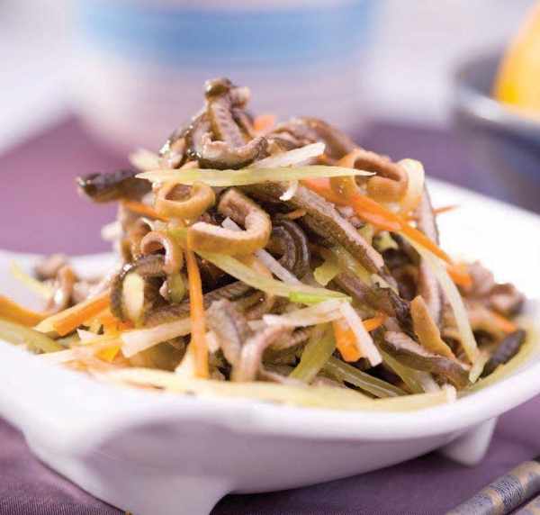 原料 凈鱔魚肉 150 克,胡蘿卜絲、白蘿卜絲、青筍絲各 50 克。