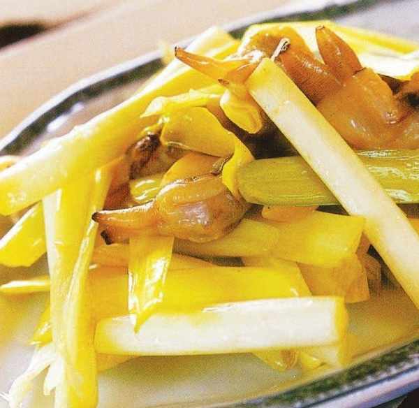 原料 蟶子肉 300 克,韭黃 200 克,紅椒絲 15 克。