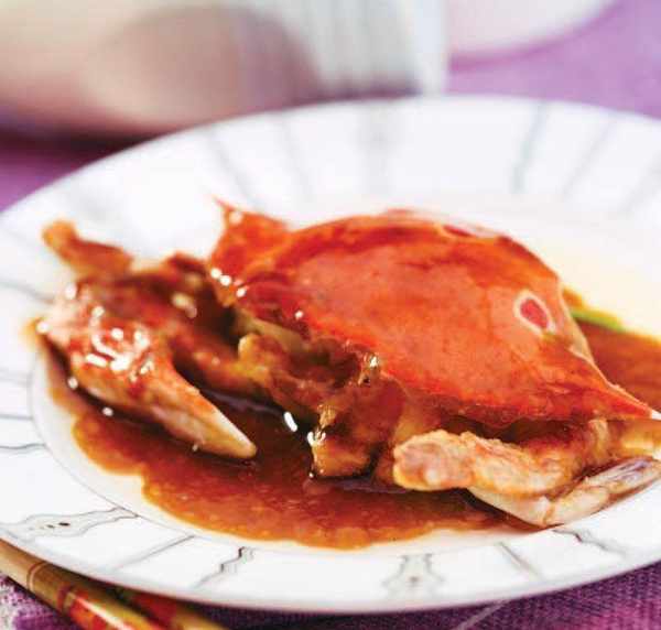 3 鍋中留少許底油燒熱,下入蔥白段爆香,加入螃蟹,烹入料酒,倒入調好的味汁翻炒均勻,出鍋裝盤即可。