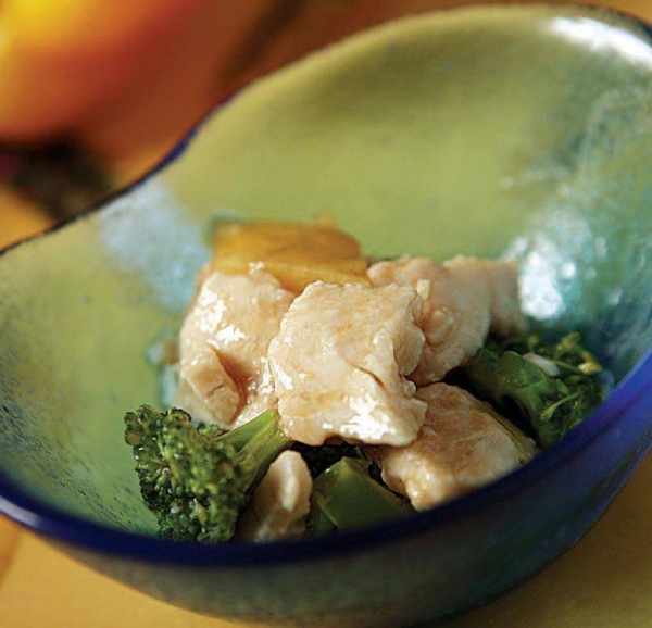 3 放入鱸魚球、西藍花、芒果片炒至熟嫩,用水淀粉勾芡,淋上香油,出鍋裝盤即可。
