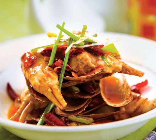 原料 凈螃蟹 500 克,幹紅辣椒 50 克,青花椒 40 克,青筍塊、藕塊各少許。