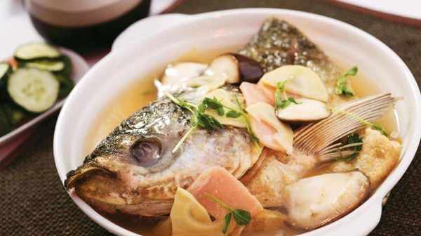 原料 鳙魚頭 1 個,熟火腿片、冬筍片、水發香菇片各 50 克,黨參、黃芪各 10 克。