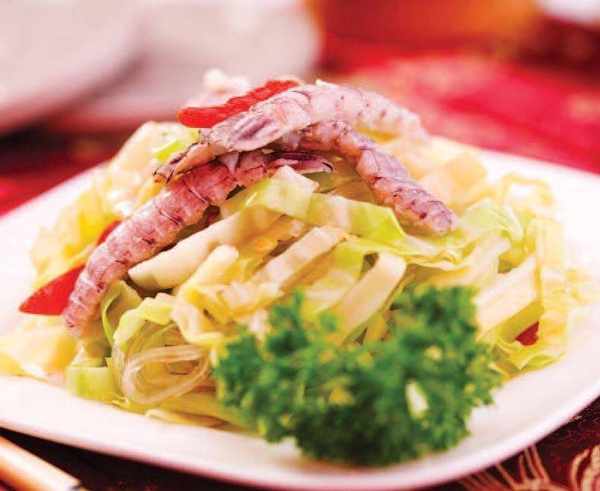 原料 卷心菜葉 400 克,蝦爬子肉 100 克,雞蛋清 3 個,水晶粉 10 克。