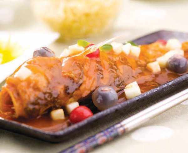 3 另起鍋,加入番茄醬略炒一下,加入果汁、白糖、蜜橘、菠蘿、桂圓、蘋果肉、櫻桃燒開,用水淀粉勾芡,淋入明油,澆淋在魚身上即成。