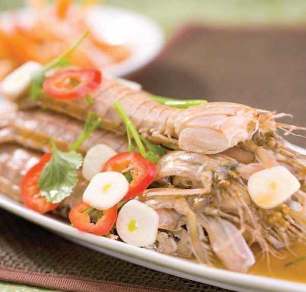 原料 大蝦 300 克,南瓜 100 克,胡蘿卜、青筍各 75 克。