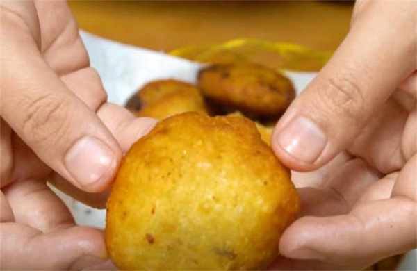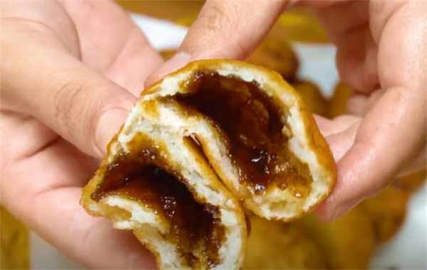6.這個糕點在我們這兒叫做糖糕,也有的地方叫做油炸糕或者是油糕,看看它外脆裡嫩,咱們掰開一個,我這次裡面放的是紅糖餡,特別的香,喜歡的朋友可以試一下。