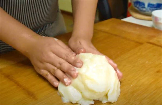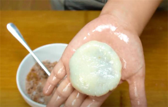 4.直接揪取一小塊,在掌心團圓,按扁,中間包糖餡,這裡一定要把收口處捏緊瞭,不然它漏糖,這樣就行瞭,就可以去炸瞭。