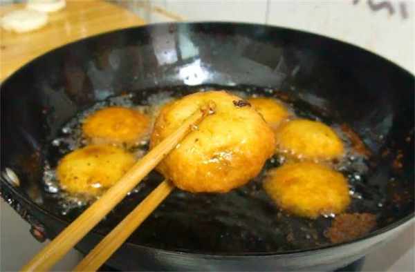5.油溫六成熱下鍋,下鍋的時候一定要小心一些,別讓油崩到瞭,炸到兩邊都定型瞭,有些硬的時候再翻面,炸到像這樣鼓起來,兩面金黃就熟瞭。