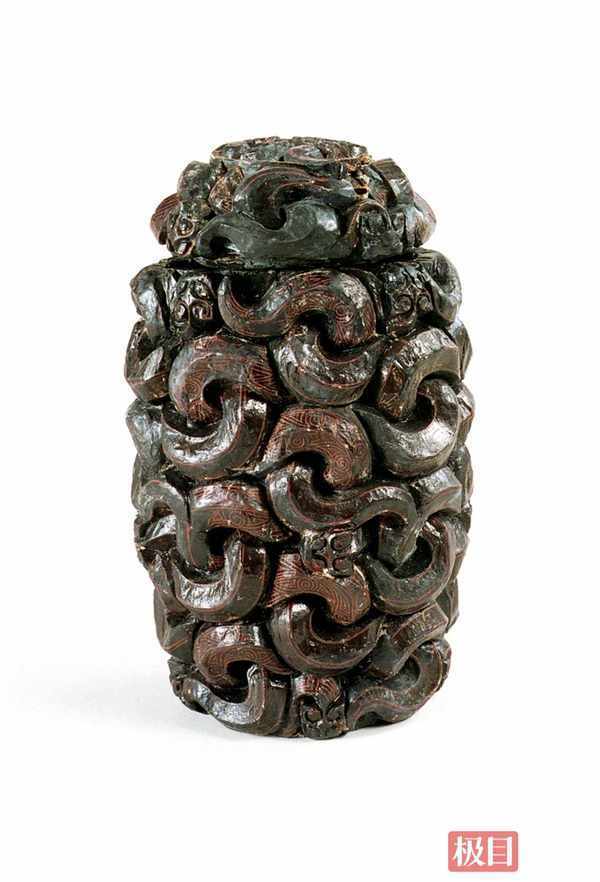 蟠蛇紋漆卮,戰國(公元前5至3世紀),口徑11厘米、底徑10.8厘米、通高20.9厘米,荊州雨臺山471號墓出土。