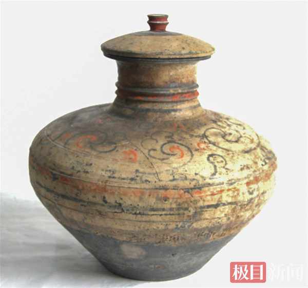 彩繪陶缶,西漢初至漢高後五年十一月庚午日(公元前2世紀初至前184年12月26日),口徑13.2厘米、腹徑29.1厘米、底徑11.6厘米、通高31.6厘米,2007年荊州謝傢橋1號墓出土。