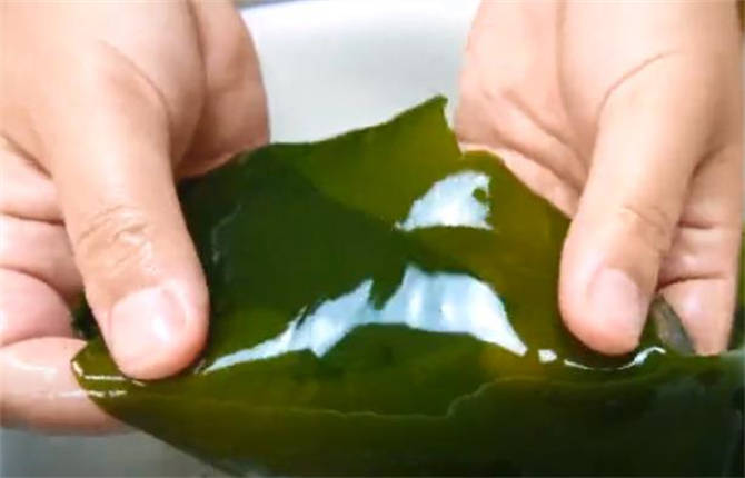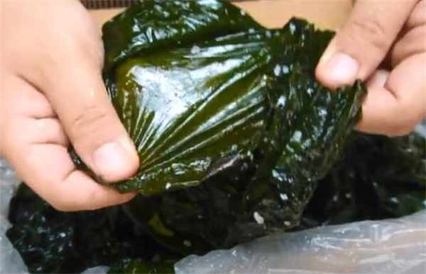 3.放在水裡泡發,現在海帶已經泡發好瞭,它的顏色更加的透亮,而且整體都變大瞭。