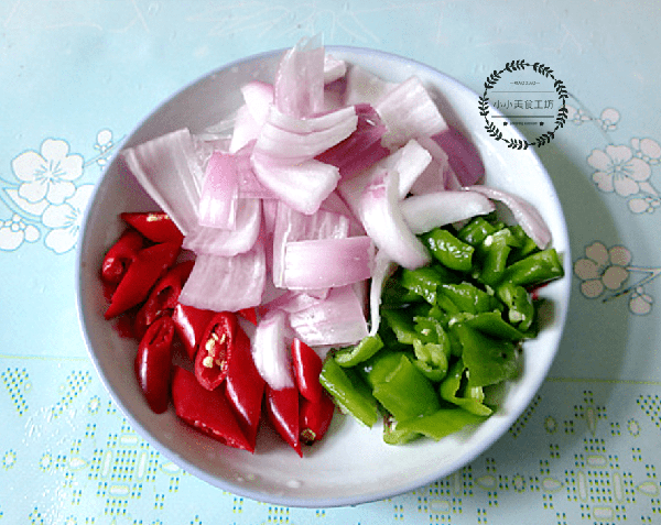 2、青紅椒和洋蔥個洗凈後切成小塊備用。