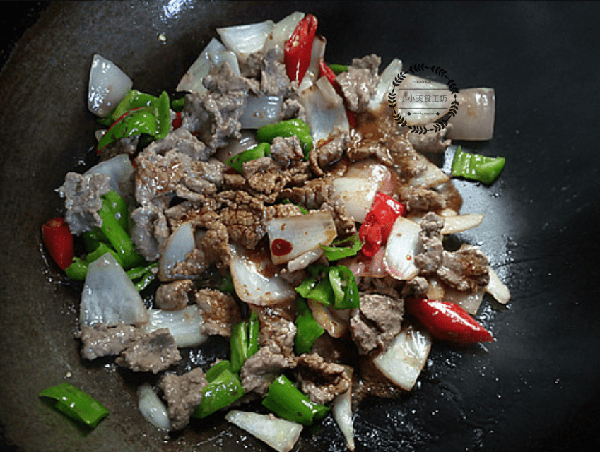 4、接著將青紅椒和洋蔥塊放入鍋中煸炒變軟,然後將炒好的牛肉回鍋,加入少許生抽和食鹽拌勻即可。