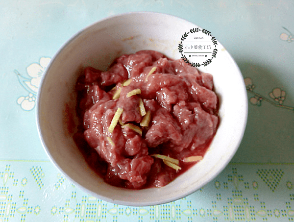 1、牛肉洗凈後切成薄片,加入適量料酒,食鹽和薑絲抓拌均勻,醃制片刻。