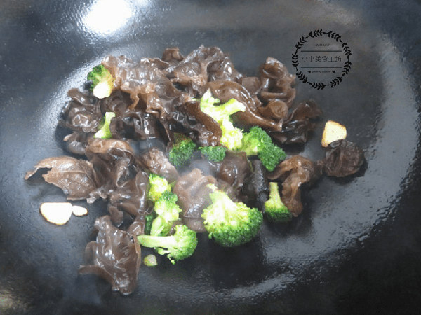 3、鍋中倒入適量油,爆香蔥蒜片後倒入西蘭花和黑木耳翻炒片刻,加入少許食鹽和生抽調味即可。