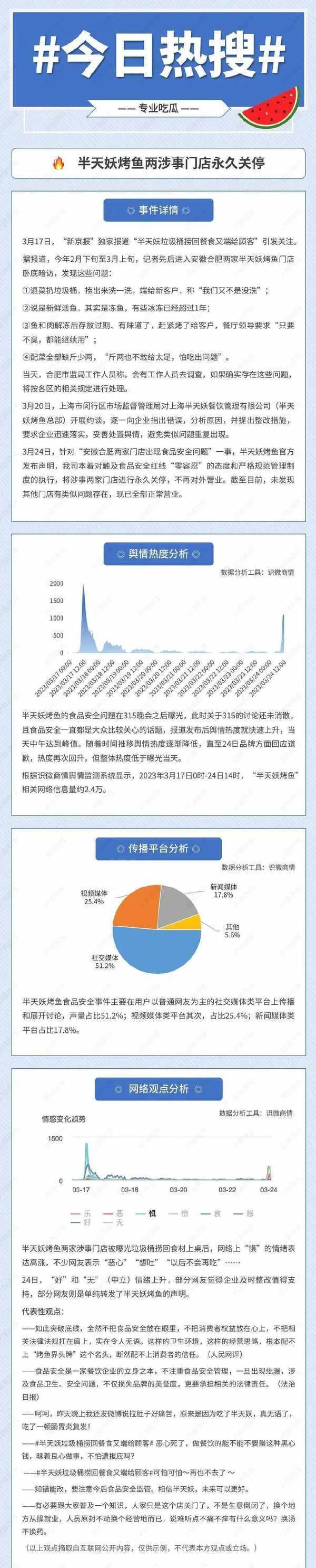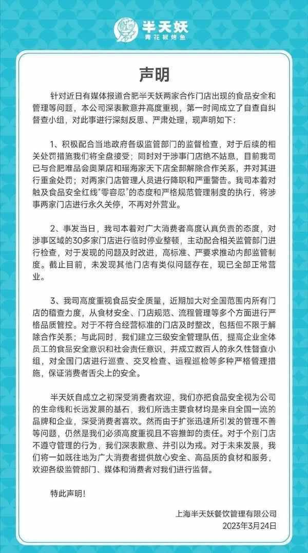 接下來再來說起一款網紅飯店,最近火爆網絡,三月底,北京消費者協會微信公眾號發佈消息,海淀區市場監督管理局2023年3月10日至3月24日持續開展餐飲食品安全大檢查工作,對海淀區37傢餐飲門店進行瞭依法查處,其中20傢暫停外賣業務,包含半天妖連鎖飯店。
