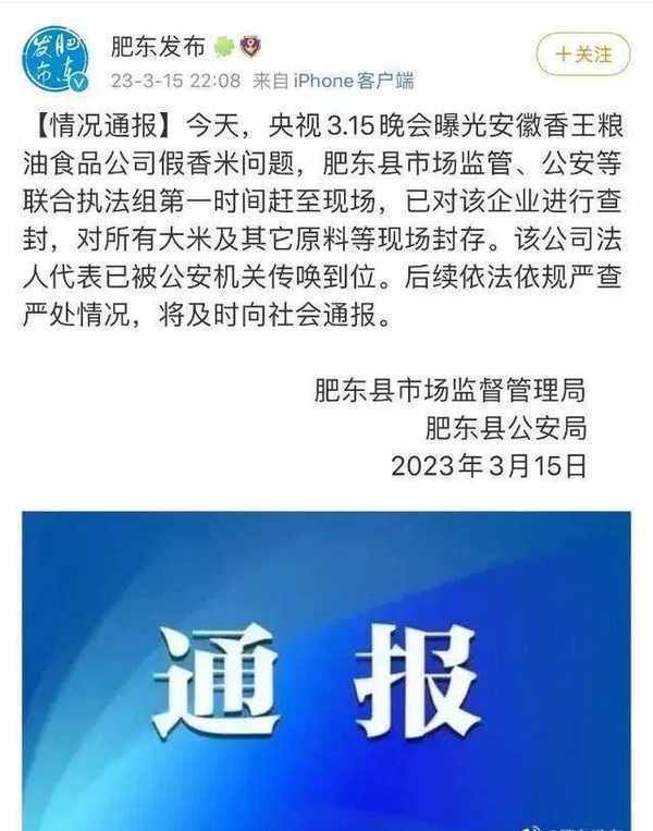 就像今年315央視點名瞭“假泰國香米”,曝光瞭香精勾兌“泰國香米”亂象,其中涉及安徽香王糧油食品科技有限公司、淮南市壽縣永良米業、淮南市楚豐工貿有限公司、上海朗楓香料有限公司等。當晚,肥東縣人民政府辦公室官方微博“肥東發佈”通報稱,已對安徽香王糧油食品公司進行查封。
