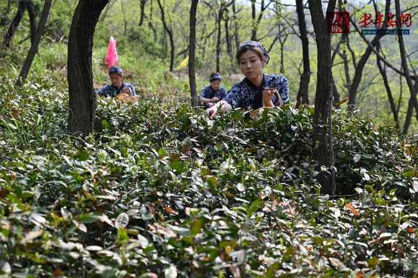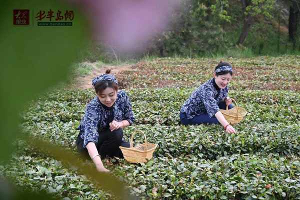 上山之路雖坎坷曲折,但周圍環境十分優美,櫻花、桃花、杏花競相開放,蟲鳴鳥叫隨處可聞,這讓達人們感到樂趣十足。踏過小橋、穿越叢林、爬上土坡,一片綠意赫然出現在眾人眼前,豁然開朗。一壟壟綠油油的茶樹向陽生長,吐露新芽。春光無限好,茶香至清歡,攝影師和抖音達人看到如此美景,一眼著迷,迫不及待舉起相機,將茶園裡的春天定格在快門裡。