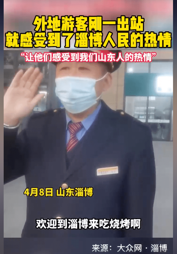 先是列車員向每一位旅客招手,歡迎大傢到淄博吃燒烤。