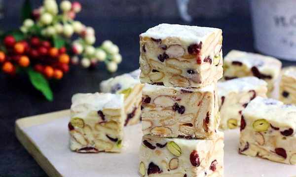 材料:棉花糖220克,黃油60克,奶粉65克,花生米100克,蔓越莓幹60克,小圓餅幹200克。