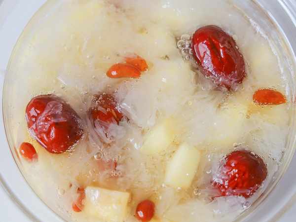 1.鮮銀耳洗凈泡撕成小朵待用,蘋果切塊