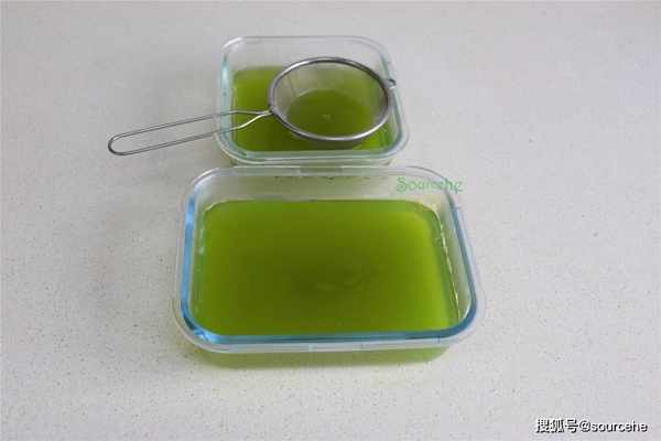 步驟5:找2個大的玻璃保鮮盒,放一個漏勺,把煮好的涼粉過篩倒入玻璃保鮮盒。過濾之後,把漏勺拿出,冷卻之後蓋上蓋子,放入冰箱冷藏,吃的時候取出。過篩,可以把漂浮物撈出,讓涼粉更細膩,口感更好。