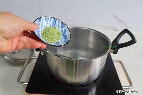 步驟3:大約煮30秒左右,快速加入抹茶粉,並且攪拌均勻。抹茶粉,剛入鍋裡的時候,浮在水面上,需要用勺子攪拌,抹茶粉遇到水,才可以溶解。