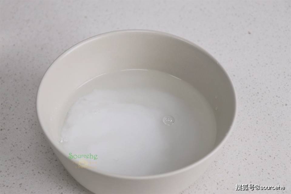 步驟1:白涼粉預拌粉倒入一個陶瓷大碗裡,取200毫升的水,倒入碗裡,一邊攪拌一邊倒入。攪拌至全部溶解。