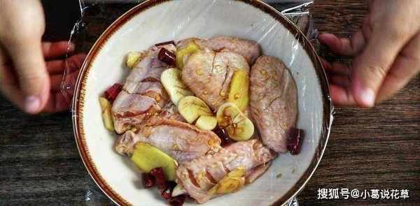 3、雞翅中倒入足量的生抽、生抽和少許料酒,加入辣椒、薑片和蒜頭拌勻,蓋上保鮮膜醃15分鐘。