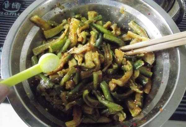 第二步:將曬幹的蘿卜放入鍋中,撒上配料,先加入適量的鹽,再加入少許醋、生抽和糖。然後將它們混合均勻。拌的時候直接用手揉,拌得更均勻,醃出來的蘿卜也會很好吃。