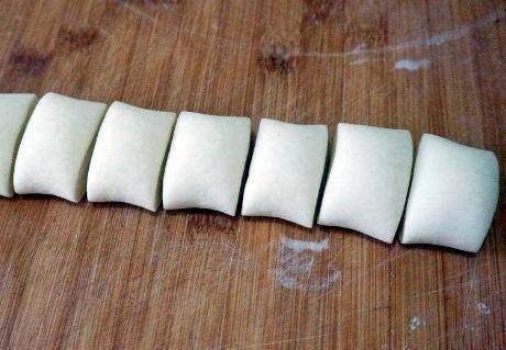 第四步,把長條整理好,切成中面,做成生饅頭,放入蒸籠,翻20分鐘,鍋裡加水,放入發酵好的蒸瓶。;