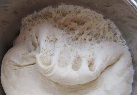 第三步是發酵到原來的兩倍大。用手攤開面團。如果上面有密集的小孔,就說明發酵成功瞭。把它放在撒瞭面粉的砧板上,揉捏以釋放空氣。;