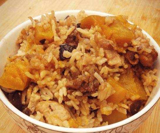 6.將南瓜和雞肉拌勻,放入電飯鍋中。煮米飯。南瓜雞飯鍛煉步驟6