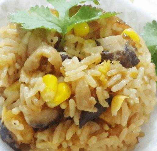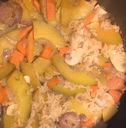 3.加入南瓜和香菇翻炒一下,關火做成南瓜雞飯