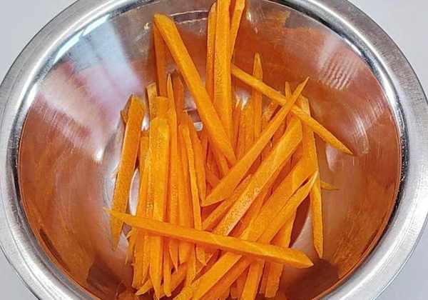 4、胡蘿卜主要的任務是要起到配色的作用,順帶豐富菜肴的營養和味道。要用上的胡蘿卜不需要多,大概有半個就夠瞭,大概在100克左右。胡蘿卜要先去皮,接著先斜刀切成薄片,再切成細絲後備用。