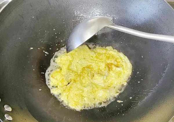 3、重新起鍋,開大火把鍋燒到冒煙,加入50克食用油,接著把打散的蛋液倒入鍋內,把雞蛋煎熟,用手勺把煎定型的雞蛋推到一邊,這樣沒有定型的蛋液就會流到鍋中間,等中間的蛋液定型後就再用手勺推到邊上,如此重復,所有的蛋液就會全部定型,接著就可以把雞蛋翻面,把另外一面也煎一下。喜歡香一點的就煎老一點,煎好後用手勺把雞蛋打成大一些的塊後就可以出鍋控油。