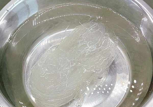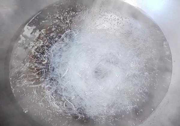 1、起鍋加水,大火把水燒開,接著把粉絲撈起來,這個粉絲會很長一根,所以我們可以用剪刀從中間剪上1刀,把粉絲剪短些分成2段或者3段,這樣食用起來更方便,然後把粉絲放入鍋內先煮一下,等鍋中的水再次沸騰後就可以把粉絲撈出。粉絲撈出後馬上倒入冷水中過涼,讓粉絲馬上冷卻下來,這樣處理後的粉絲更不容易成坨,後期炒制的時候才更容易炒散,炒好後的口感也更好。